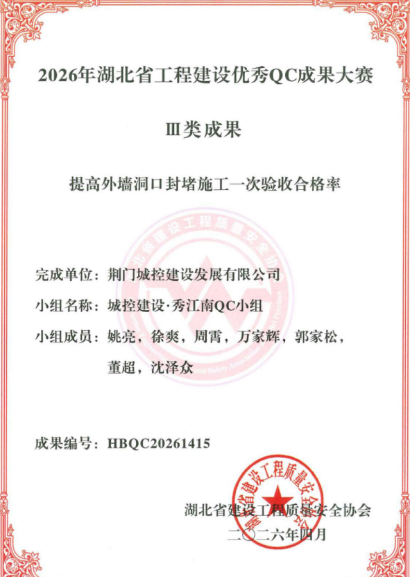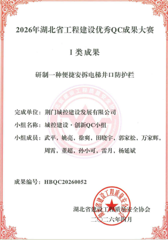 近日,荆门城控建设公司申报的两项QC成果,在2026年湖北省工程建设优秀QC成果大赛中脱颖而出,其中《研制一种便捷安拆电梯井口防护栏》荣获Ⅰ类成果奖、《提高外墙洞口封堵施工一次验收合格率》荣获Ⅲ类成果奖,为公司“管理提升年”活动再添亮眼实绩。